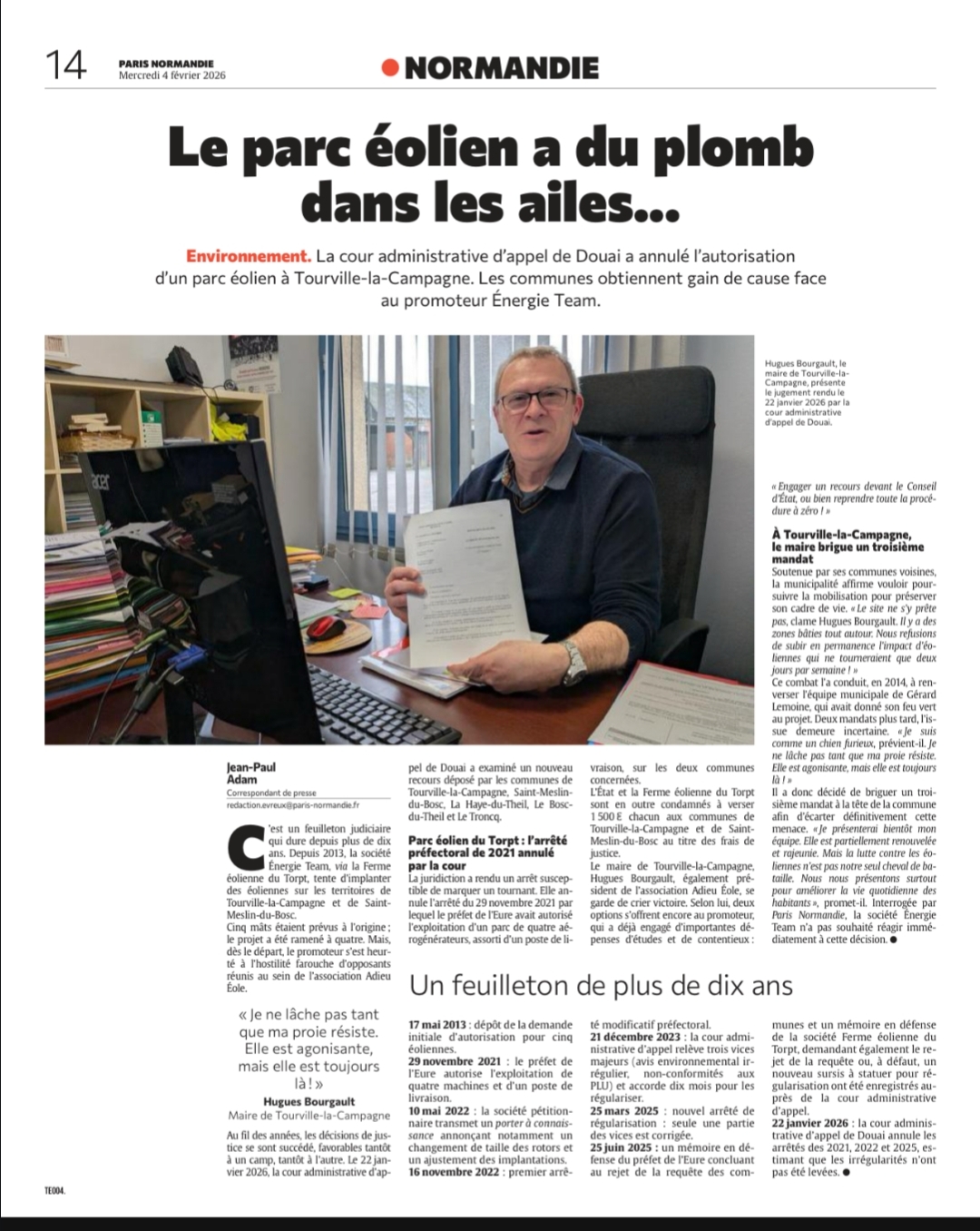 Une consultation du public aura donc lieu du 6 janvier au 6 février 2025 (sorte d’enquête publique allégée, sans commissaire enquêteur). Le dossier sera consultable en mairie de Tourville la Campagne et de Saint-Meslin du Bosc ou sur le site de la Préfecture www.eure.gouv.fr rubrique /Actions-de-l-Etat/environnement/Consultations, enquêtes publiques et participation du public par voie électronique (PPVE)/Consultations publiques/ICPE.